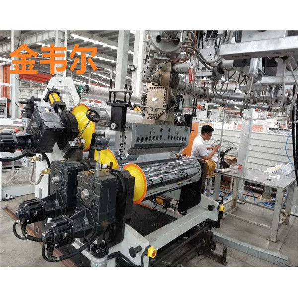 Üç silindirli perdah makinesi esas olarak kumaş askılı tip kalıptan ekstrüde edilen yüksek sıcaklıkta eriyiği perdahlamak ve gerekli ürünleri oluşturmak için belirli bir kalınlığı korumak için kullanılır.